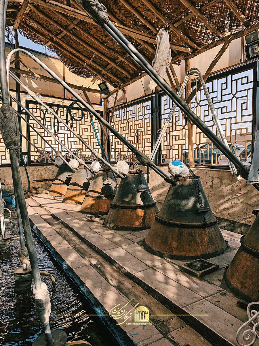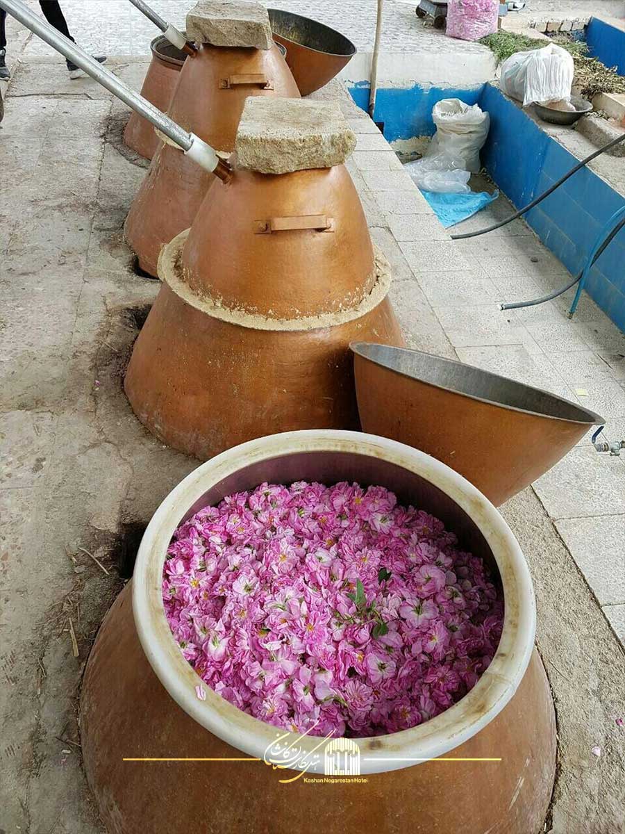 در ابتدای فرآیند گلاب گیری، دیگهای مسی که محلیها به آن تغار میگویند روی شعله های اجاق قرار میگیرند و پس از پر شدن از گل و آب، درشان بسته و به دیگ پیچ و مهره میشود. با رسیدن آب داخل دیگ به نقطه جوش، بخار به وسيله لوله آلومینیومی از دیگ به پارچهای عرقگیری که در آب چشمه نشستهاند، هدایت میشود. بخار در پارچ خنک به گلاب مایع تبدیل میشود. درگذشته، کاشانیها با دیگهای سفالی، نیهای چوبی و حرارت بوته و هیزم گلاب می گرفتند. فرآیند گلاب گیری از هر دیگ چهار ساعت زمان میبرد و ازهر دیگ ۳۰ تا ۴۰ کیلوگرم گلاب نصیب پارچهای مسی میشود. گلابگیران میدانند که گلاب خوب، گل فراوان و سرحال، آب کم و حرارت یکنواخت میخواهد. محصول خوب تلخ است و شفاف و بوی ترشیدگی یا پختگی نمیدهد. با این حال گلاب ناب کاشان گلاب دوآتشه است که این روزها در کمتر کارگاهی تولید میشود. برای تولید این گلاب بعد از یک بار تقطیر و گلابگیری، گلاب به دست آمده به جای آب به همراه گلهای تازه داخل دیگ ریخته و مجددا تقطیر میشوند.